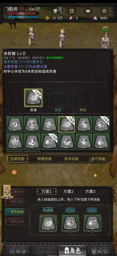 给大家分享一些技能搭配思路:核心技能选择寒冰箭与冰封破,辅助技能则包括爆炸箭、雷霆旋、暗影斩、雷皇斩、血爆术、闪电箭、疾风斩和挥砍。核心技能优先挑选高范围、大半径的;辅助技能则优先考虑目标覆盖多、具备群攻效果的。