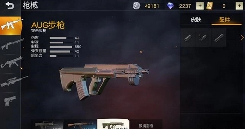 AUG是首款加入空投的步枪,它在步枪品类里弹匣容量是最大的,并且自带二倍镜,伤害数值为41。