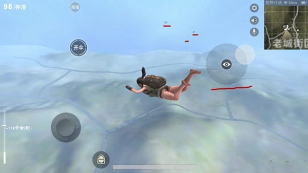 然后同时向上拖动方向键和小眼睛图标,就能快速滑翔;具体能飞多远,得看你滑动的位置并及时调整。要是没滑到目标地点,可以观察四周带白点的方向,就近降落捡一波物资,再继续冲过去——毕竟远距离的地方人通常很少。