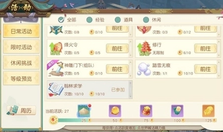 在《神雕侠侣2》中,玩家们可以通过任务、战斗、活动来获取经验值,而其中在日常活动中,有一项上限次数为10的专门刷经验的活动,宝塔型的图标,旁边有上升箭头的经验,名字就叫“修行”!可谓很直观了,而在“修行”中,玩家们可以根据自己等级,在古墓三层任意选择一层,再加上多倍经验丹,然后在加上自动巡逻和战斗,根本不用自己管,经验就会滚滚而来!那么,下面就给大家介绍一下神雕侠侣2修行活动,也就是古墓修行的玩法。