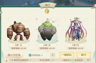 修行可以选择单人或是组队,但是古墓里的怪一般来说并不强大,所以完全可以单人刷,而关于等级推荐,玩家们也不用太担心,经测试,40级以上,并且阵容中有两个S级侠客,完全可以单刷古墓第三层,但是由于与等级不匹配,经验值可能会降低。