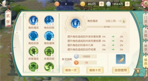 修炼能够增加角色、侠客和宠物的百分比属性,其上限和人物等级相关联。每次进行修炼操作,都需要耗费银币、帮贡,以及秘参、鹿茸、灵芝这类材料。
