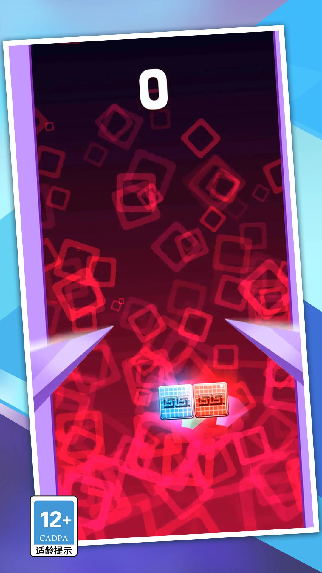 玩家需要协助画面里的红蓝两个方块避开迎面而来的各类障碍物。点击屏幕时,两侧的方块会朝着点击的位置靠拢,以此来躲避障碍物。