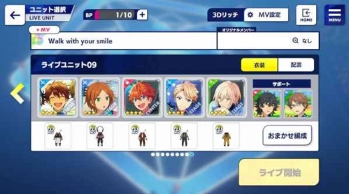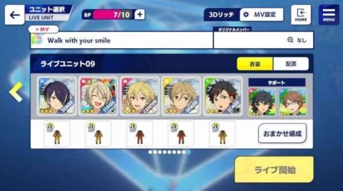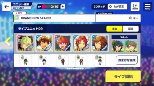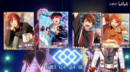 选歌界面的声线比较多,选了听起来和选歌界面没什么区别的偶像们组了一个队伍,位置不可变,会和选歌界面有一点点偏差