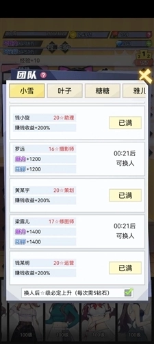 4、团队成员升级时,建议优先选择能提升赚钱百分比的成员用钻石升级(每次升级建议都花钻石保底,这个升级到满级需要较长时间)