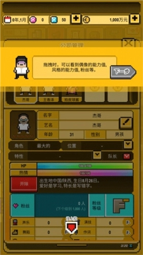 5、进行拖拽操作时,能够查看偶像的能力值、风格的能力值以及粉丝数量等信息;