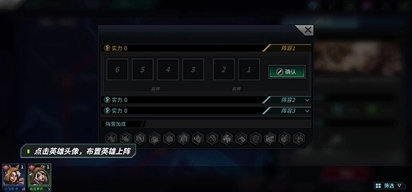 4、点击英雄的头像,布置英雄上阵,有几个英雄上场几个英雄,选择好之后点击确认;