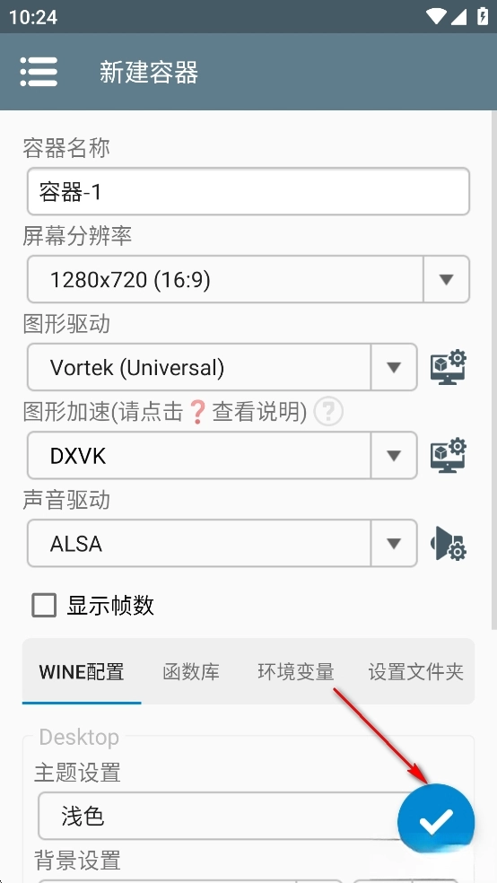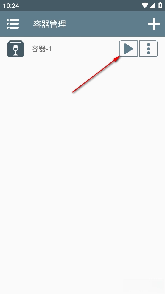 1、启动游戏后,点击右上角“+”图标创建容器。无需配置,点击右下角“√”即可完成创建