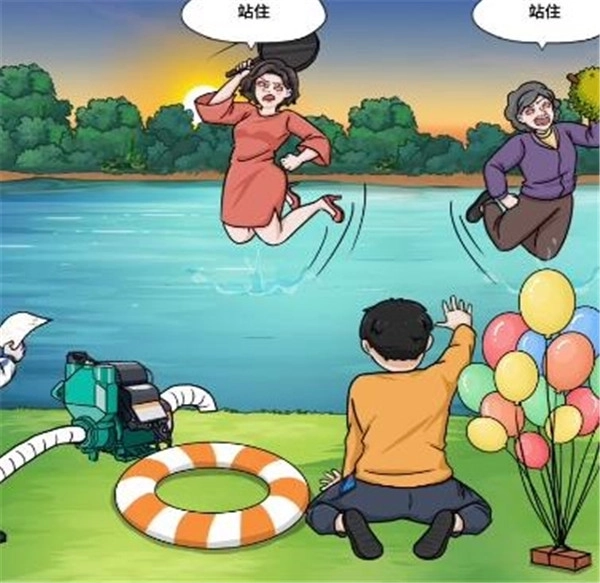这个关卡既简单又有趣,我来给大家简要说明一下玩法:画面里的其他道具其实都是干扰项,关键是要把后方的太阳往左边滑动——这么一来时间就从白天切换到了晚上,就能看到儿子放学回来了。不过儿子手里拿着的是零分试卷,这可把老婆和老妈都气坏了,她俩直接从水里回到了岸上,我们也就顺利完成了营救。这波操作能成功,多亏了儿子的“神助攻”呢!