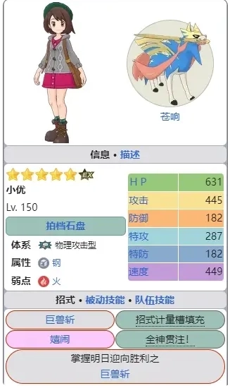 小优&苍响作为老牌钢属性输出手,强度和宝可梦的宝具等级直接挂钩——一宝表现拉胯,五宝才能展现真正实力。不过它们的自带BUFF链比较薄弱,得靠辅助来提升属性。巨兽斩这个技能需要对手有气魄时才能打出高伤害,而玩家抽苍响大多是为了开钢系沙龙,但敲音猴在沙龙里的表现其实不算特别突出。至于要不要抽五宝苍响,我觉得目前没必要,毕竟有莉莉艾和主角的索尔迦雷欧在,钢系输出已经够用了,建议把糖果留给新拍组。最后必须说一句:淘金潮真的强!!推荐指数:一颗星