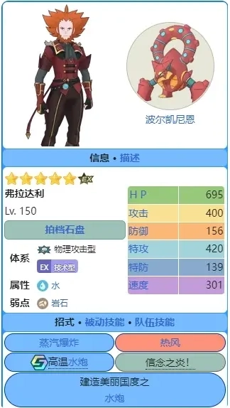 弗拉达利与波尔凯尼恩的组合被玩家称为“水火”,是实力强劲的水系输出搭档。过去他们曾和双忍蛙一同构成顶尖水队(不过现在这个组合的地位似乎有所下降)。实际上,哪怕只用到“水火”中的波尔凯尼恩,也能在队伍里发挥作用,它比较明显的问题是卡气槽——这几乎是所有强力攻击型群星角色都会碰到的通病。另外,波尔凯尼恩需要目标处于灼伤状态才能完全发挥实力,所以遇到无法被灼伤的对手,它的效果就要打对折。目前在水系角色里,我不太推荐大家自选波尔凯尼恩,毕竟下级水系中有普池五神之一的强力选手大力鳄,还有能在雨天体系中充当核弹的巨沼怪,相比之下波尔凯尼恩的优先度就没那么高了。推荐指数:三颗星。