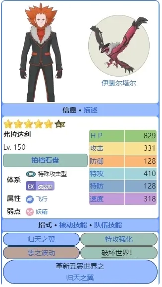 弗拉达利与伊裴尔塔尔组合,作为老牌飞行系输出手,同样是四格气槽的选手,卡气问题想必大家都清楚。它最大的短板在于生存能力太弱,140级时防御大概只有120左右,随便被攻击一下就掉半血。虽然“死亡之翼”技能能回血,但释放后会降低自身双防,而且它的输出也不算特别突出。现在有黑连搭配风露双龙卷云卷的强势组合,有洛奇亚靠场地和蛋糕就能自给自足,还有烈咬陆鲨(沙龙)和风露、高傲雉鸡(雏鸡)这类顺属性就能强势输出的组合,这些无疑都比伊裴尔塔尔更值得投入资源,所以不太建议自选这个组合。推荐指数:一颗星