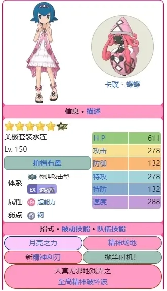 水莲&卡璞·蝶蝶作为四岛神之一,是精神场地体系下的强力打手。当初上线时争议不断,如今却让不少玩家后悔错过——它兼具辅助与输出能力,同步技能的无衰减群攻十分出色,别动技能还能在精神场地下提升全队招式伤害,搭配蛋糕后更能附加速战型,堪称超能系的核心支柱。这里非常推荐大家抽取,推荐指数:★★★★★
