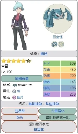 大吾&巨金怪:作为老牌钢系输出拍组,一宝就能获得其他拍组三宝才有的“自身攻击越高拍招伤害越高”的特性。不过由于它也带有mega效应,会导致拍招伤害降低,所以对应的石盘作用几乎可以忽略不计。我平时使用巨金怪时,会在mega后通过BUFF给自己附加挺住状态,这样在连战中能配合铁头的畏缩效果,让它多存活几个回合。目前巨金怪主要用于开启沙龙,但沙龙里的摇篮百合一般用不上,因此不建议自选。推荐指数:一颗星。