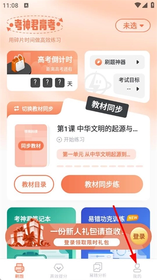 1、在刷题页面,点击右下角的“我的”选项,即可进入个人页面。
