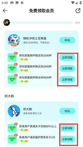 4、继续向下滑动屏幕,就能直接体验游戏,完成任务后点击【立即领取】按钮,成功获取会员后就可以免费收听歌曲啦。