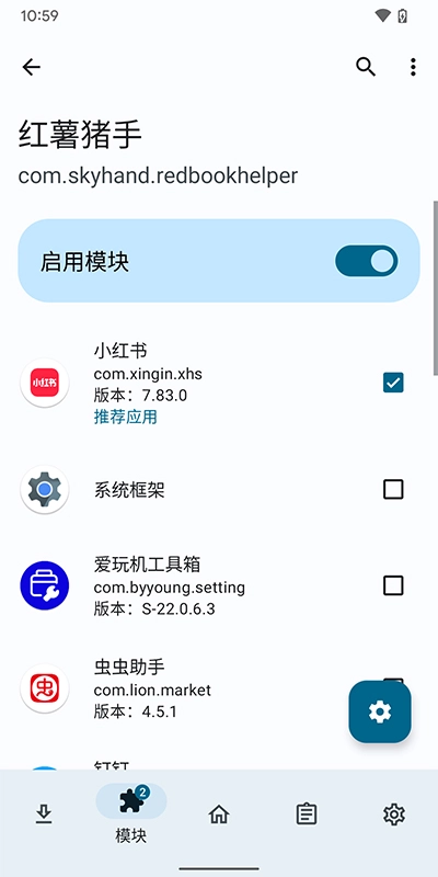 2、在框架管理器中点击“红薯猪手”,启动该模块,然后选择小红书应用进行使用。