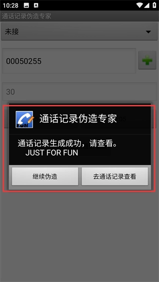 4、看到【通话记录生成成功】的提示后,若想添加新记录,可点击【继续伪造】;若要验证结果,则点击【去通话记录查看】即可。