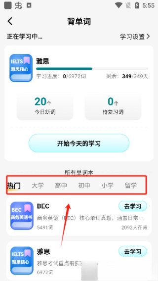3.点击顶部的单词书列表,挑选合适的教材后就能开启学习。
