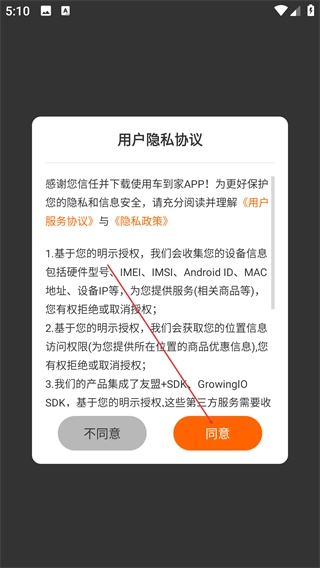 1、打开车到家后,阅读【用户隐私协议】,了解【设备信息】-【位置信息】等授权说明,点击【同意】按钮进入应用。