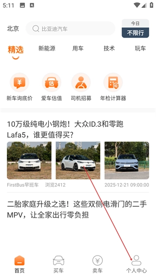 2、进入首页后,可通过顶部搜索栏查找车型,点击底部【个人中心】进入对应页面。
