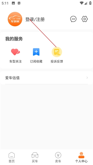 3、在页面中,可操作【车型关注】-【订阅收藏】等服务,也能使用【爱车估值】功能,点击顶部【登录/注册】进入登录流程。