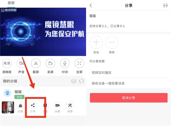 注:(1)已分享设备的成员管理,可在“魔镜慧眼”主界面“个人中心”-“我的分享”中操作。