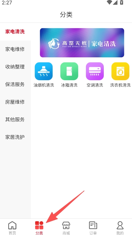 1、提供服务分类选择功能,含家电清洗房屋维修等类别,选择所需的家庭服务类型。