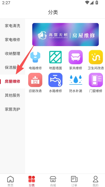 2、在分类中选择房屋维修类别。