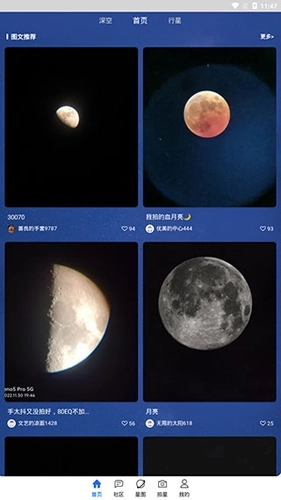 如果有一些拍摄得很美的星空照片,大家也可以来浏览查看。我们可以直接滑动屏幕,然后点击首页下方的位置,就能直接进行查看了。要是想了解更多详细内容,点击【详情】按钮,就可以看到更多点赞、评论等互动信息啦!