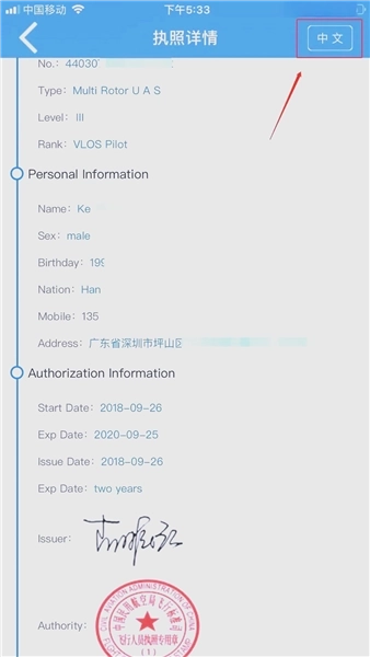 2.登录后点击“更多”按钮,就能看到执照及相关等级的列表,点击列表里的不同项目可以查看执照及相关等级的详细信息,详细信息页面可以通过右上角的按钮切换显示信息的语言(目前仅支持中文和英文)。