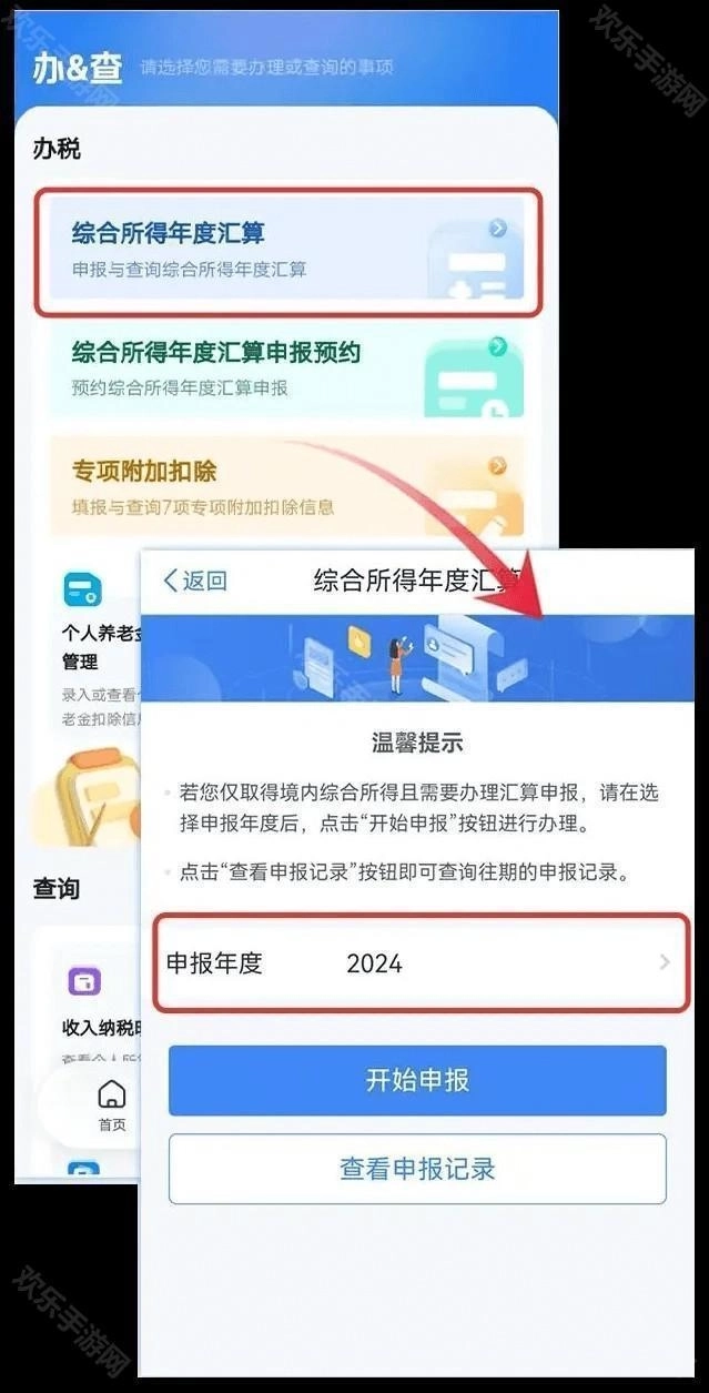 2、您也可以在首页的【办&查】功能里,点击【综合所得年度汇算】选项,然后选择申报年度为【2024】,这样就能进入年度汇算流程了。