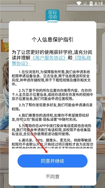 2、进入后阅读并同意辰轩学府的用户协议
