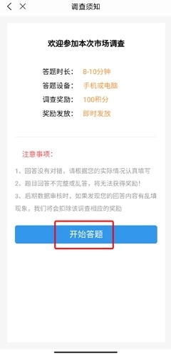 2、查看调查须知,点击开始答题按钮就可以了。