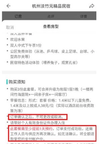 2、点击【查看详情】,了解购买相关注意事项,特惠房型(或使用房券)一旦订单确认便无法更改或取消,建议在预订房间前仔细了解清楚相关规则。