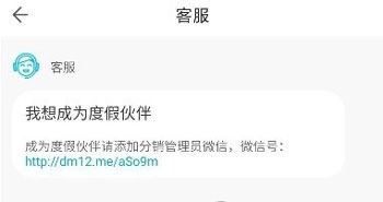 2、点击【度假伙伴】选项,系统会自动跳转至客服页面,在该页面点击相关链接可进入分销管理员的微信界面,添加对应微信号并提交成为度假伙伴的申请,审核通过后即可获取相应佣金。