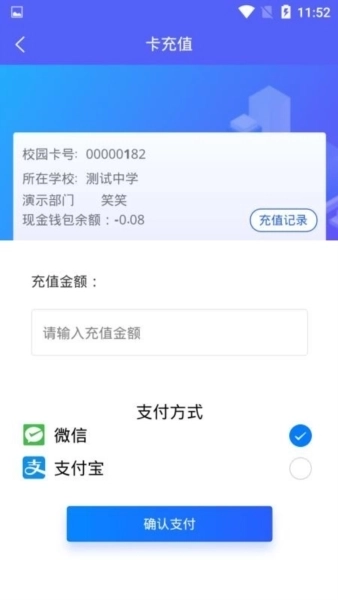 6、用户可通过微信或支付宝,快速为校园卡余额进行充值;