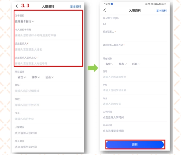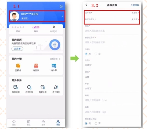 3、登录成功后,点击“账号”选项,按照页面指引完成基本资料与入职资料的上传操作。