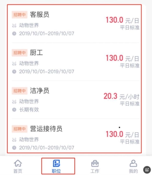 4、基本资料与入职资料全部上传完成后,可进入“职位”模块,选择“单位”分类下的“动物世界”来浏览岗位,并依据自身需求申请职位。