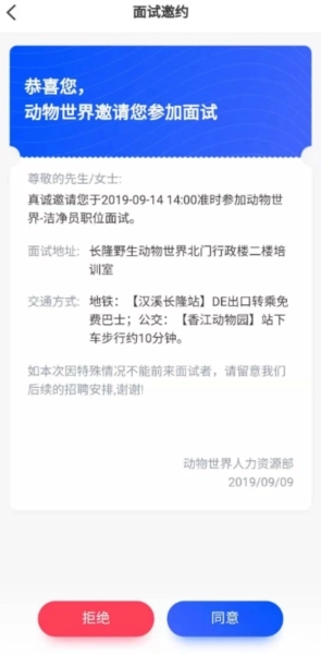 6、收到面试邀约后,请点击“同意”确认,并按照HR告知的具体时间前来参加面试,面试时请出示相关的面试邀约信息。若未收到面试邀约,则当天不安排面试。