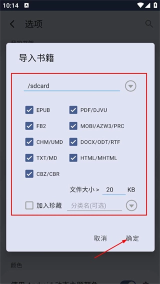 4、进入导入书籍的页面后,先确认书籍格式等相关设置,再点击确定按钮,即可完成书籍导入的操作。
