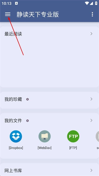 1、在静读天下的首页,点击左上角的菜单按钮,展开侧边栏菜单。