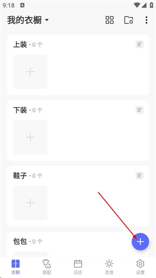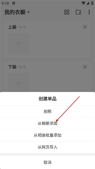 1、进入我的衣橱页面后,点击右下角的蓝色加号按钮,系统会弹出创建单品的操作菜单。