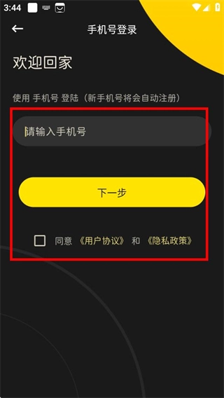 4、在手机号登录页面,填写手机号并勾选协议后,点击下一步按钮。