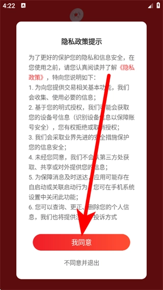 1、打开开思汽配,在隐私政策提示页面,点击我同意,进入登录界面。