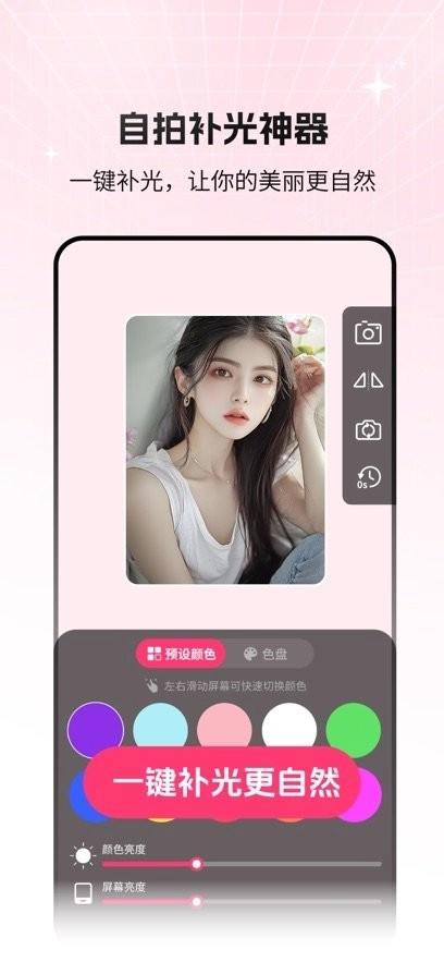 这是一款自拍美颜神器,能够便捷高效地满足您的在线照明需求,还能让您随时在线体验各类不同的光源。您只需左右滑动屏幕,就能看到更多丰富多样的灯光效果。