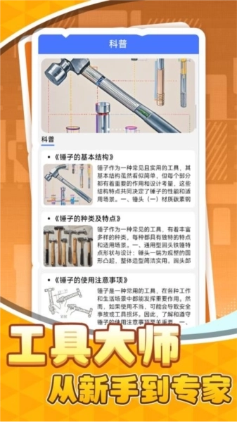 1、锤子科普:应用内收录了详尽的锤子科普内容,用户能在此获取各类感兴趣的锤子相关信息,无论是传统款式的锤子,还是现代多功能锤子,都能找到。