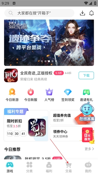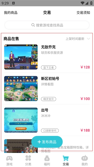 1、在应用首页点击底部【交易】,进入游戏商品交易界面。