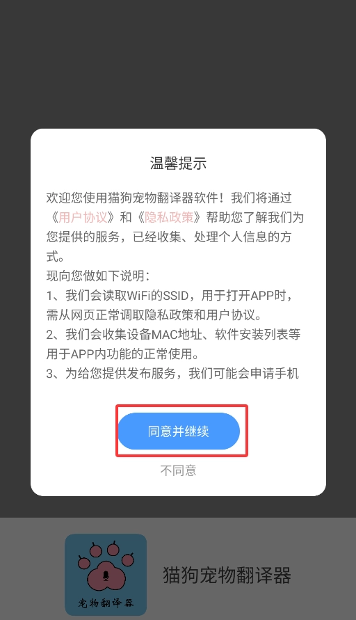 1、初次打开猫狗宠物翻译器应用,系统会弹出用户协议确认窗口,需点击“同意”按钮才能进入应用的主界面。