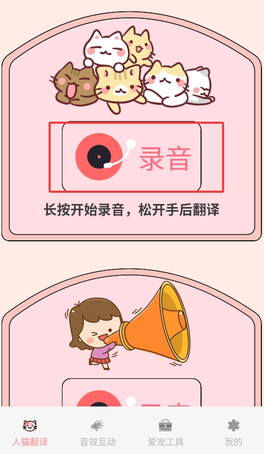 2、宠物语言翻译页面配备了录音功能按钮,点击该按钮就能录制宠物的叫声,进而得到对应的翻译结果。